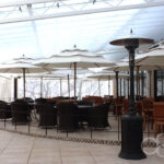 写真のような大型の黒いパラソルをカフェのテラス席に設置することで、落ち着いた雰囲気を演出できます。黒い色合いは高級感と洗練されたイメージを与え、カフェのブランドイメージを高める効果があります。また、広範囲に日陰を提供できるため、お客様が快適に過ごせる空間を確保でき、暑い日差しや突然の小雨からも守ってくれます。
