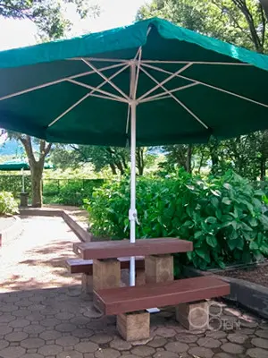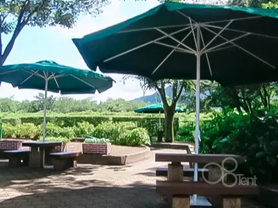 デザインと機能性の融合。ハンドル式グリーンパラソル。