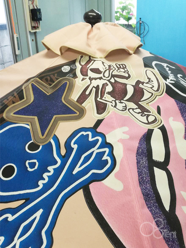 特注のマーケットパラソルを製作いたしました。前面フルカラープリントにて特注柄に印刷した生地で、天幕をお作りしています。