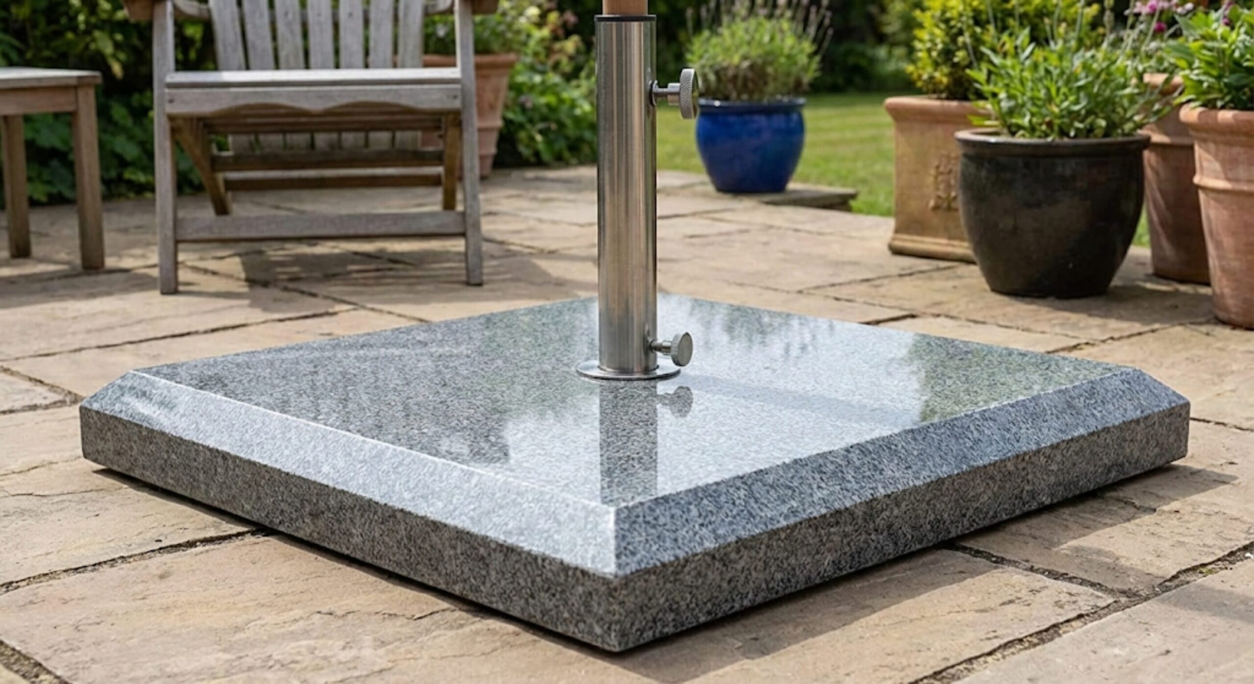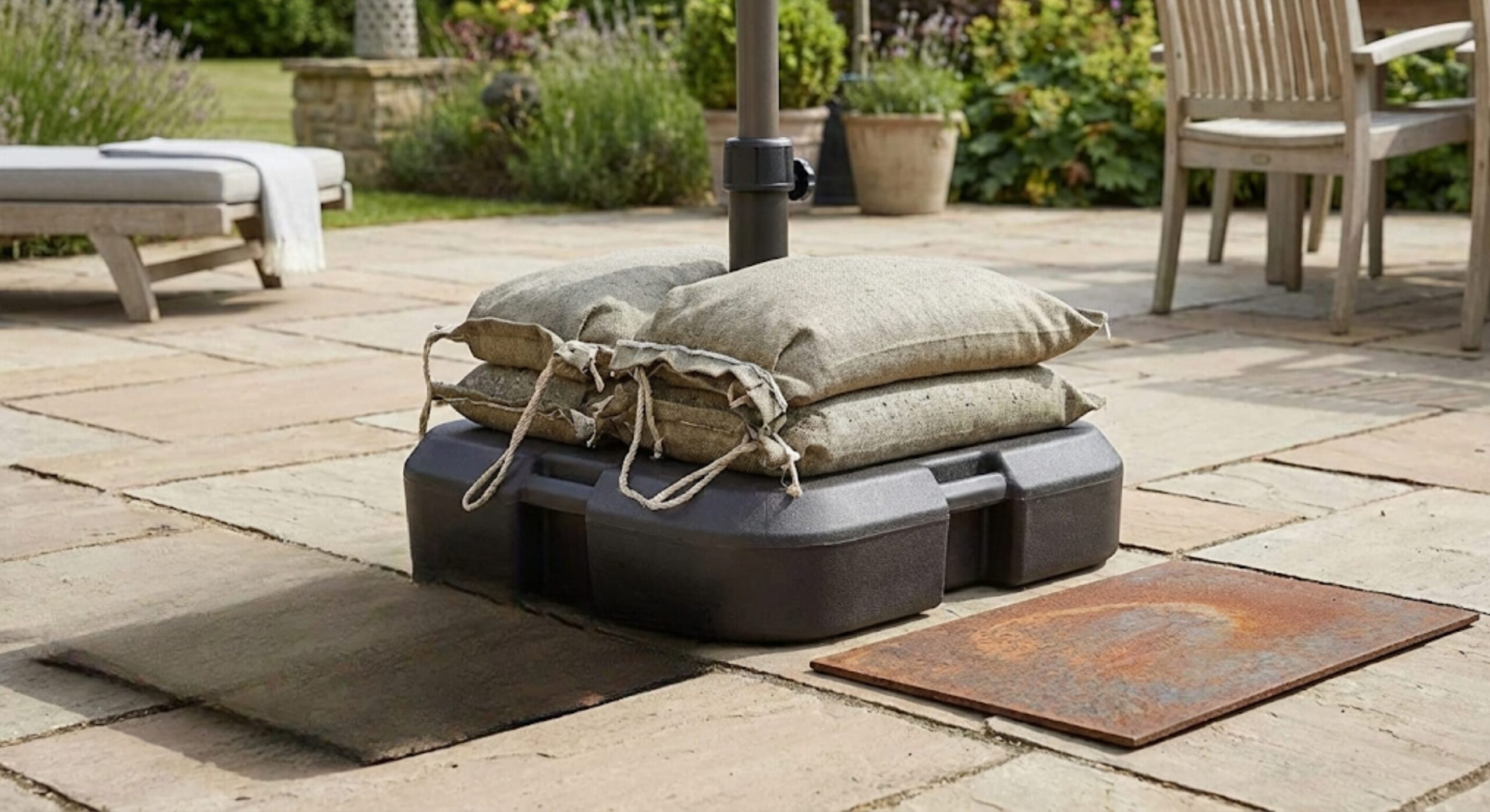 パラソルの倒れ防止の基本は「十分な重さを足元に設けること」です。